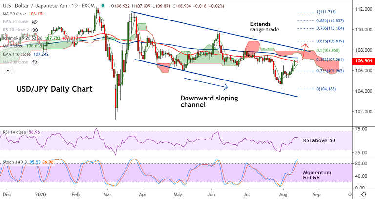 On the flipside, 55-EMA is immediate support at 106.75. Break below will negate any upside bias.