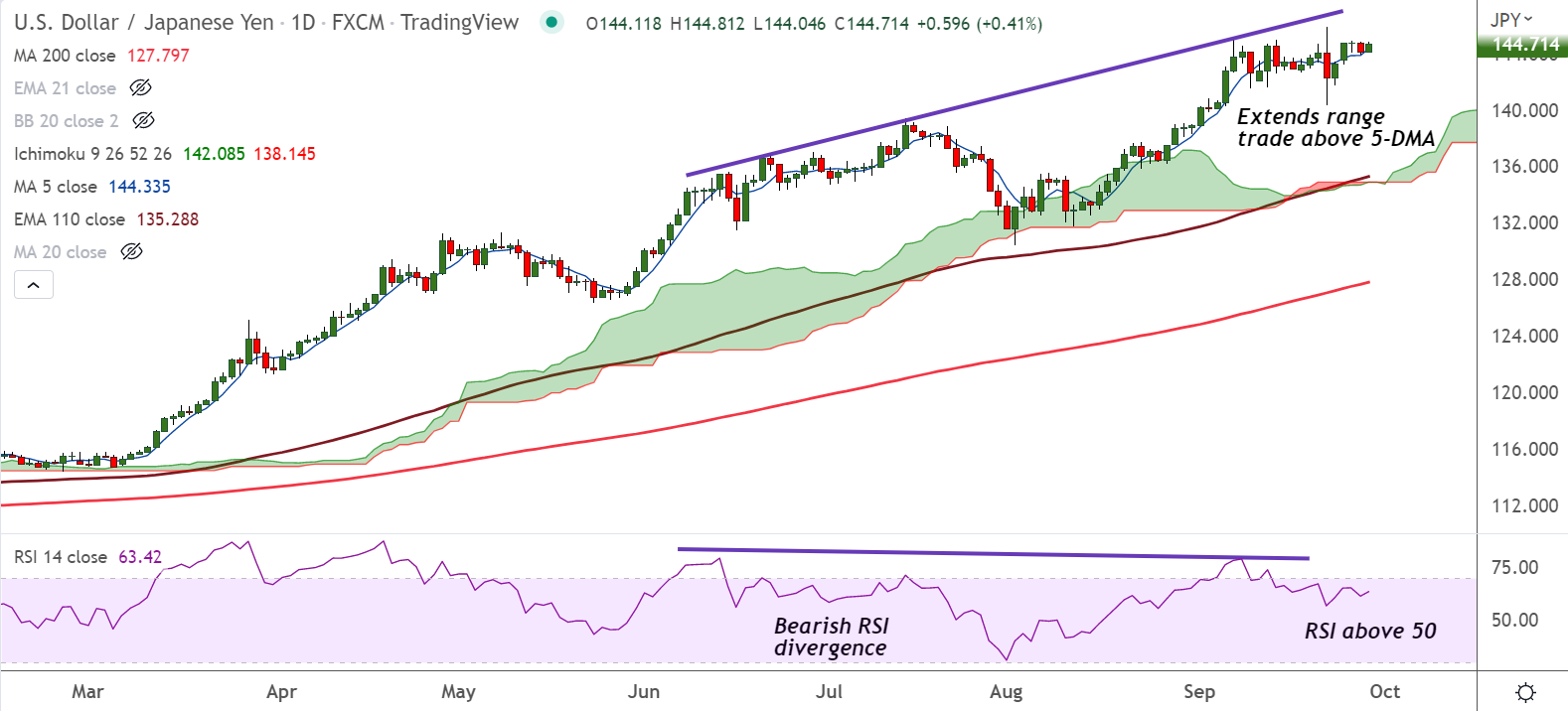 The major is extending sideways grind for the fourth straight session, hovers around 5-DMA.