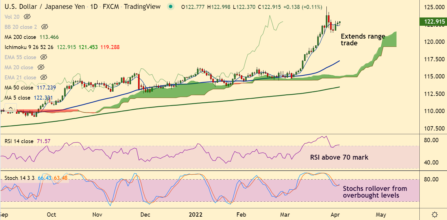 - The pair extends range trade with session high at 122.99 and low at 122.37