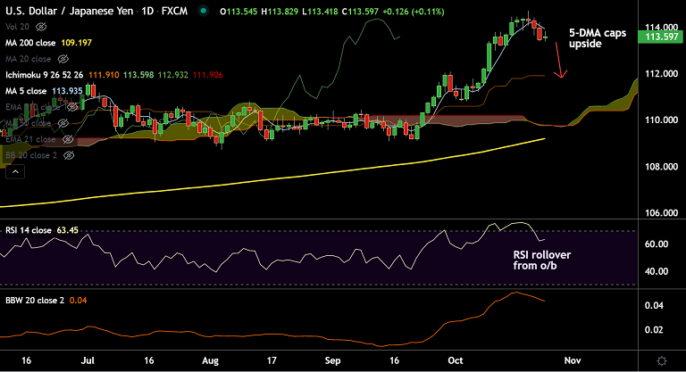 Stochs and RSI are showing a bearish rollover from overbought levels. Dip till 21-EMA at 112.80 likely.