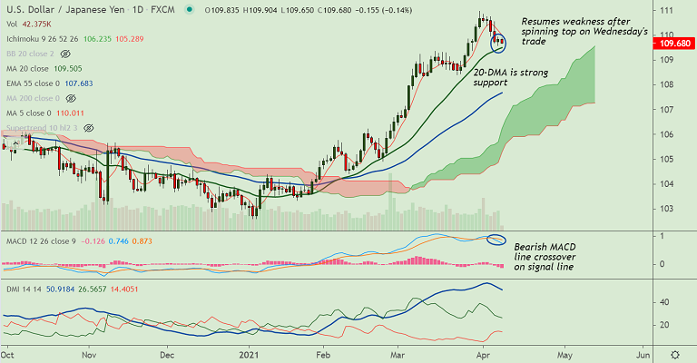 Strong support is seen at 109.50 to 109.30 range. Breach below could drag the pair lower. Bullish invalidation only below cloud and 200-DMA.