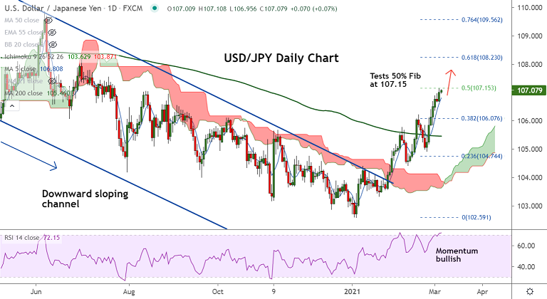 The pair tests 50% Fib at 107.153 on Wednesday's trade and hit levels unseen since 23rd July 2020.