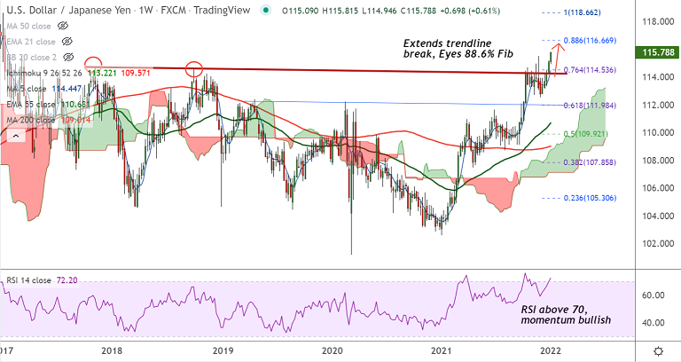Major Support Levels: 115.23 (5-DMA), 115, 114.53 (76.4% Fib)