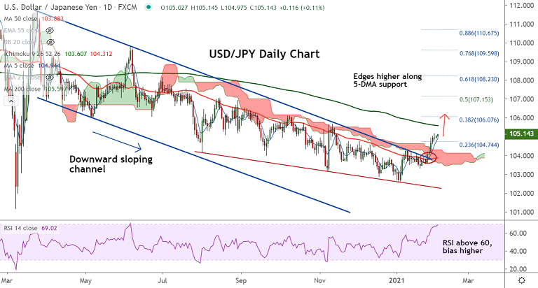 5-DMA is immediate support at 104.94. Break below will see retrace till 110-EMA at 104.60. Retrace below cloud negates any bullish bias for the pair.