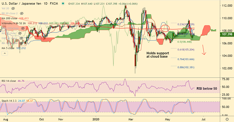 Break below daily cloud will see downside resumption. Weakness till 61.8% Fib at 105.20 then likely.