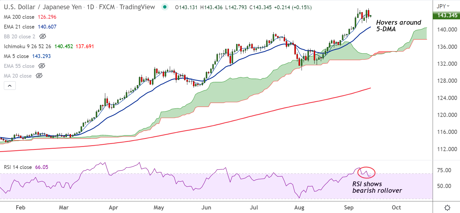 USD/JPY was trading 0.22% higher on the day at 143.45 at around 03:15, major bias remains bullish.