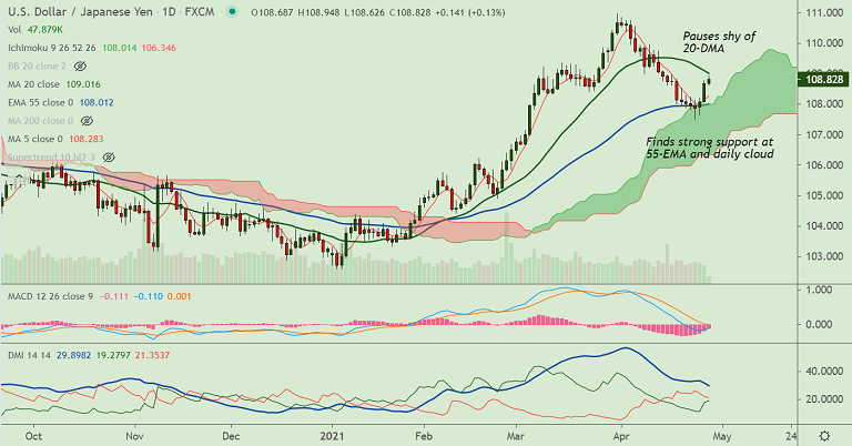 The major is currently trading shy of 20-DMA resistance at 109.01. Watch for breakout above for upside continuation.