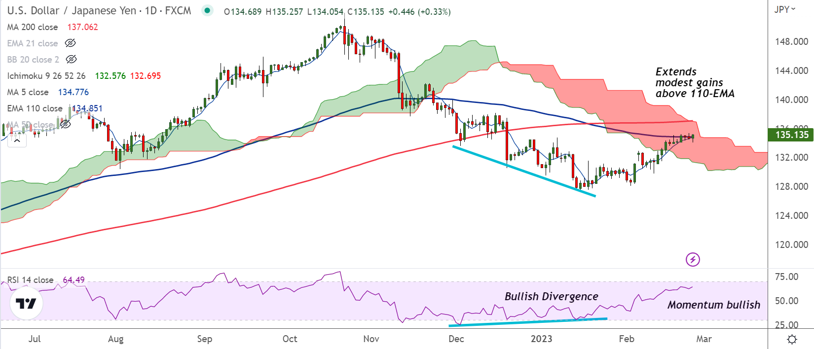 Summary: USD/JPY trades with a bullish bias. Scope for test of 200-DMA at 137.06. Rejection at 110-EMA negates any upside in the pair.