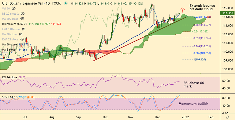 USD/JPY was trading 0.09% higher on the day at 114.43 at around 05:15 GMT, outlook is bullish for the day.