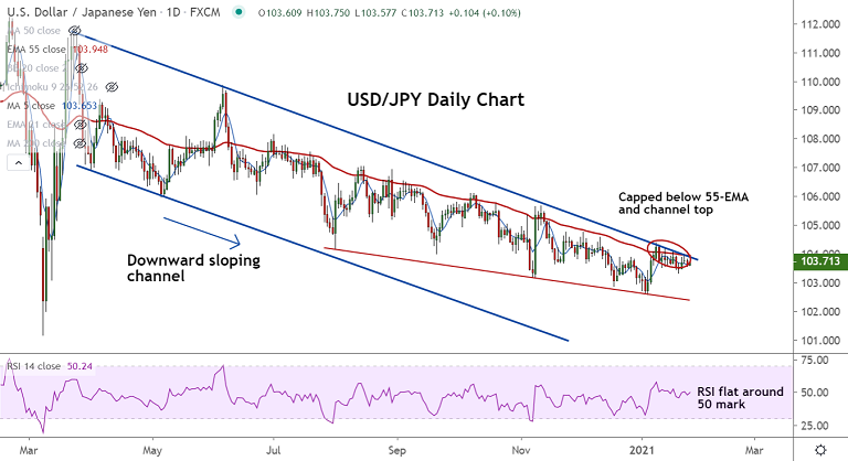 Bulls need to break stiff resistance at channel top and 5-EMA at 103.95 to suggest confirmed up-move in the pair.