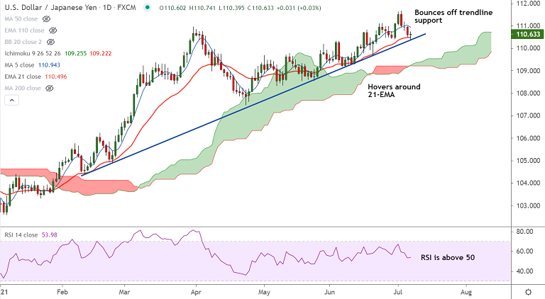 Break below 110.35 will see weakness, while on the flipside, retrace above 5-DMA will see upside continuation.