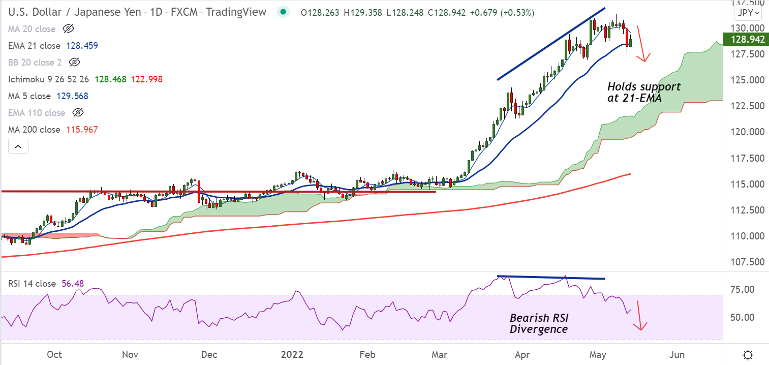 - USD/JPY was trading 0.57% higher on the day at 128.99 at around 04:40 GMT