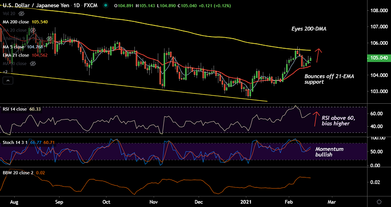 Technical bias for the pair is turning bullish. Rejection at 200-DMA in last week's trade has held support at 21-EMA.