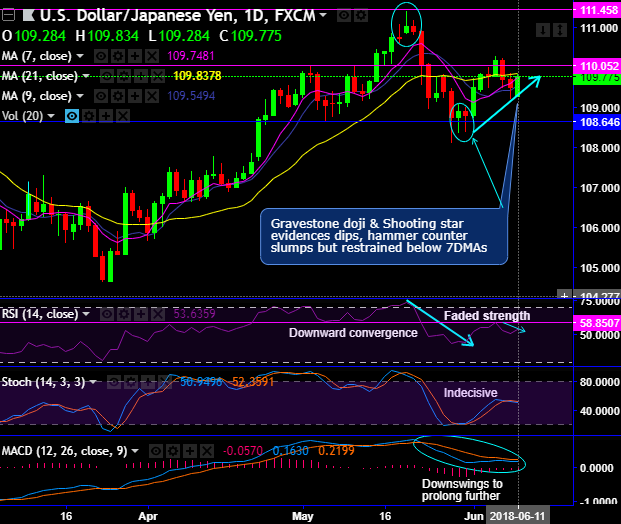 Ever since the occurrences of these bullish patterns at the bottoms, the rallies attempted to bounce above 7DMA levels, but unable to sustain above stiff resistance levels of 110.052-110.284 that indicates the uncertainty.