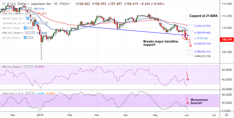USD/JPY is trading weaker on the day, down 0.05% at 108.01 at 03:55 GMT.