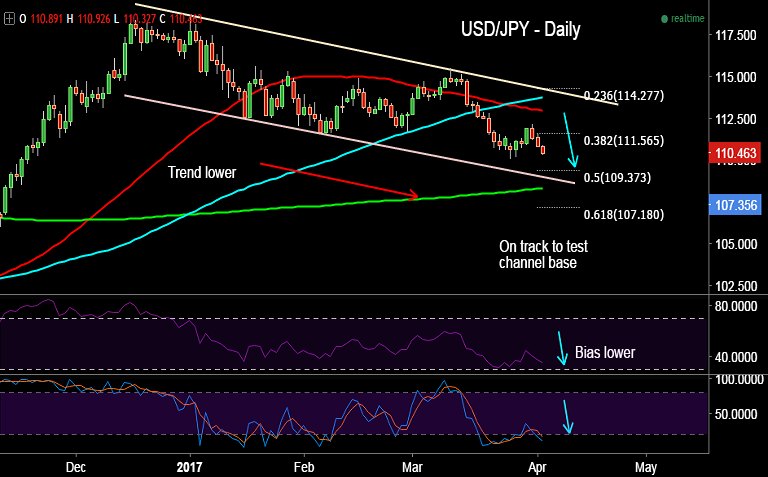 - USD/JPY is trading a falling channel, we see scope for test of channel base at 109 levels.