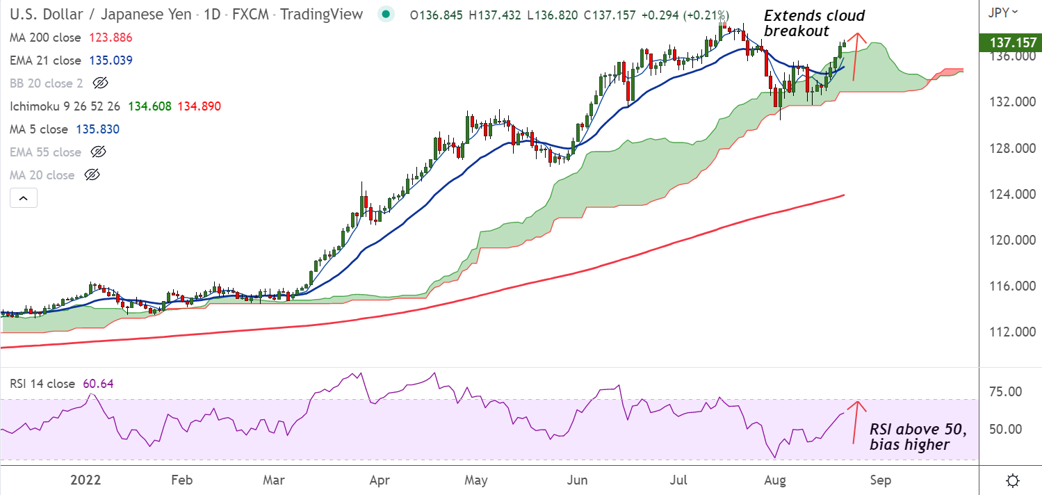 Summary: USD/JPY trades with a bullish bias. Pullback has bounced off cloud base support. Breakout above cloud has opened upside. Scope for pair to refresh yearly high above 139.38.