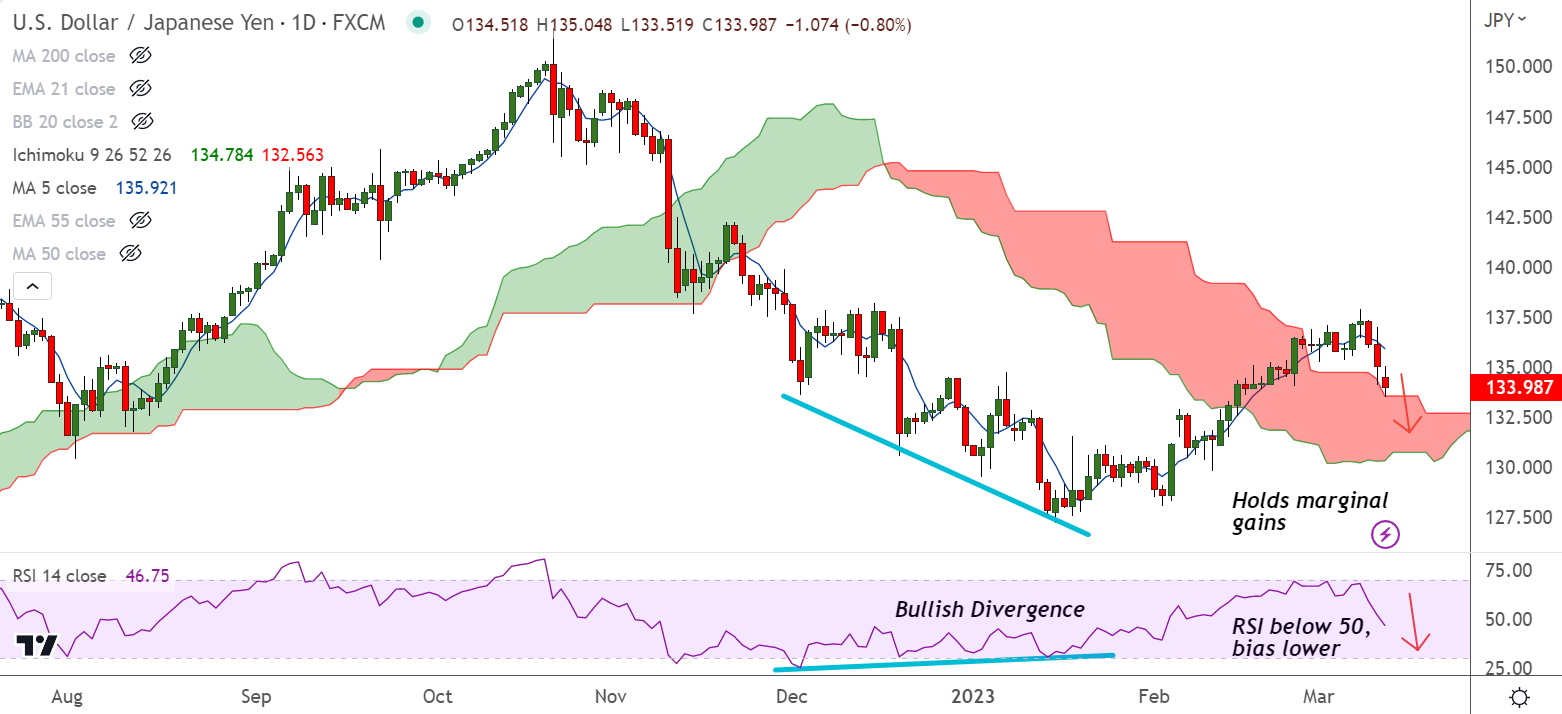 Summary: USD/JPY was trading with a bearish bias. Daily cloud is offering minor support, break below will drag the pair lower.
