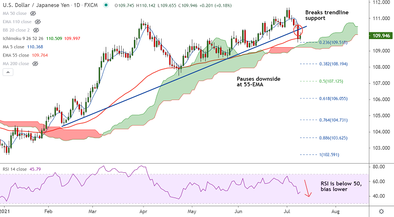 The pair has paused downside at 55-EMA support, break below will see further weakness.