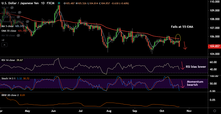 Price action was rejected at 55-EMA, momentum has turned bearish. RSI is well below 50 and biased lower.