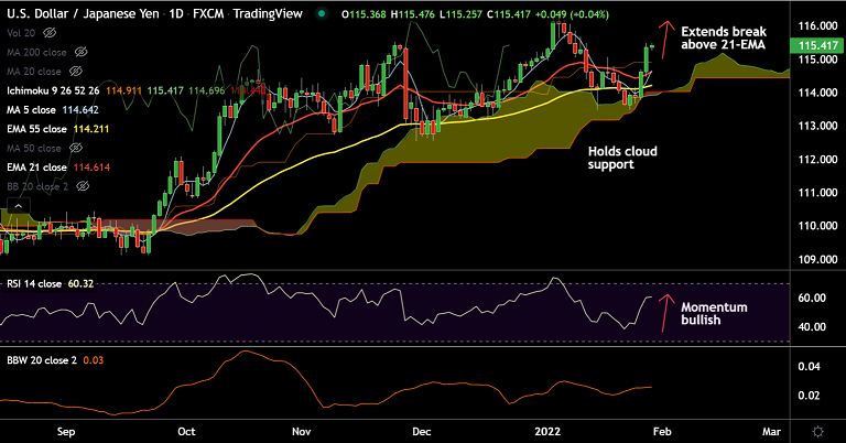 Summary: The major has snapped a two week downside and has resumed bullish bias. Price action has broken above 20-DMA and is on track to test 116 levels.