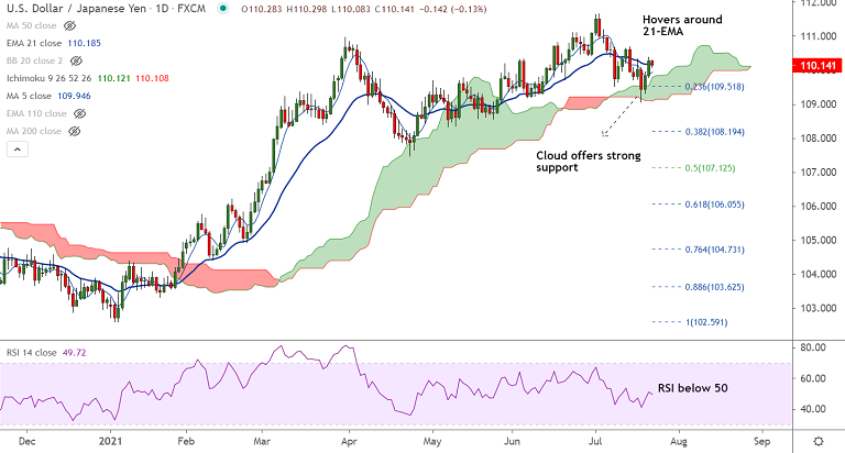 20-DMA is immediate resistance at 110.39, break above will buoy bulls. Bullish invalidation only below daily cloud.