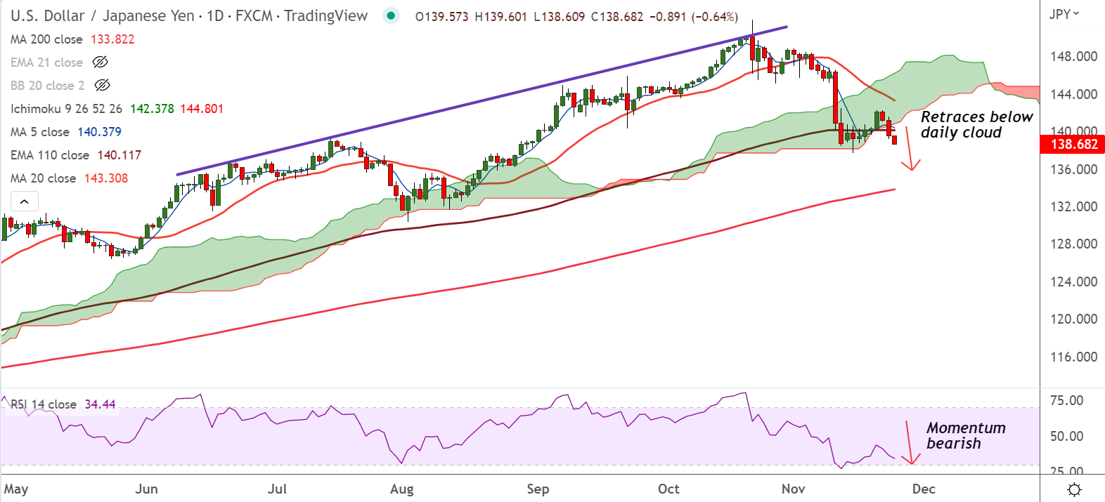 USD/JPY was trading 0.56% lower on the day at 138.78 at around 05:45 GMT. The pair is extending a three-day downtrend, has retraced below the daily cloud.