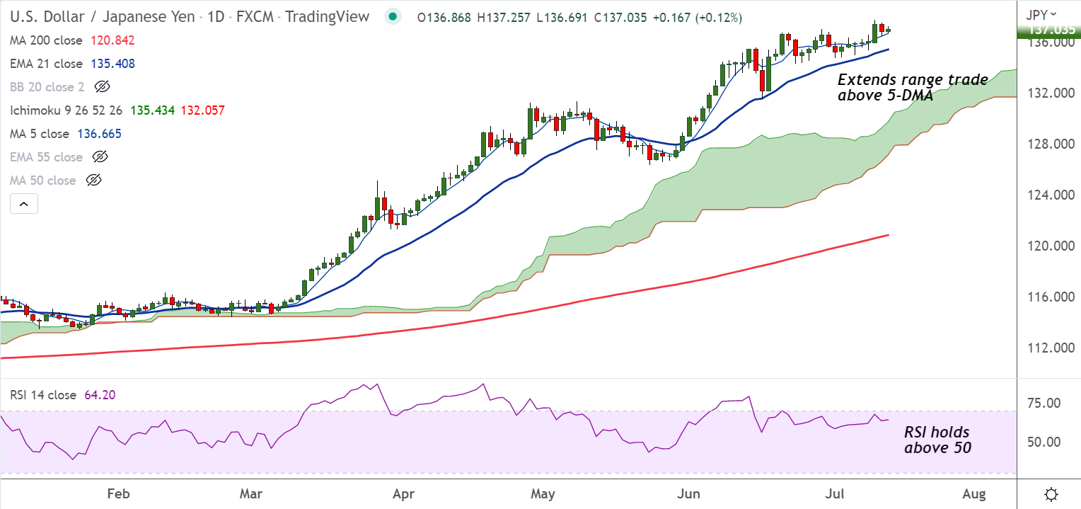 Technical indicators support upside in the pair. Price action is above 5-DMA and momentum studies are bullish.