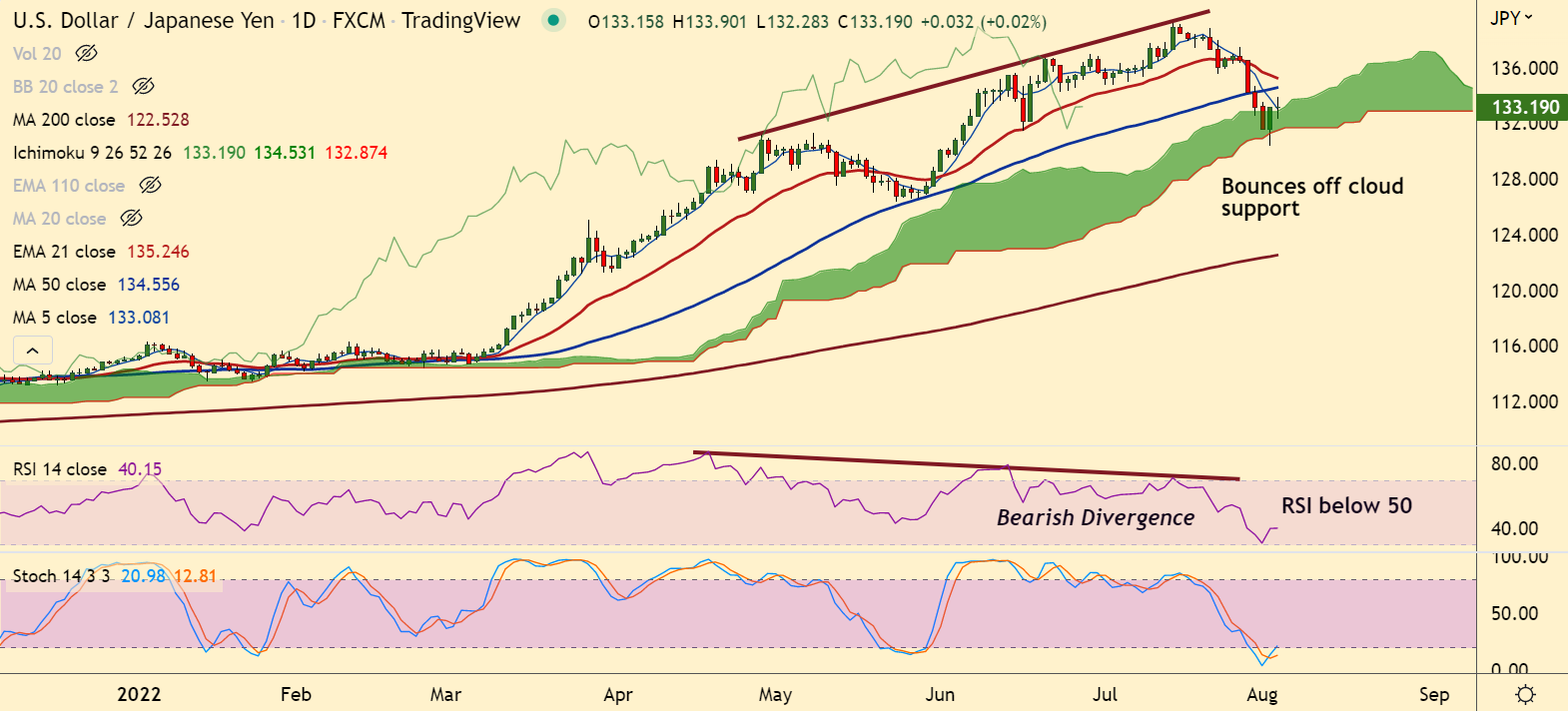 USD/JPY was trading 0.22% lower on the day at 132.85 at around 05:05 GMT. US dollar consolidates previous session's gains, bounces off cloud base support.