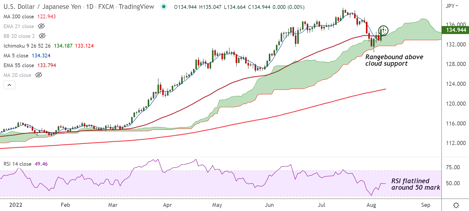 USD/JPY was trading 0.04% lower on the day at 134.89 at around 05:10 GMT, bias neutral.