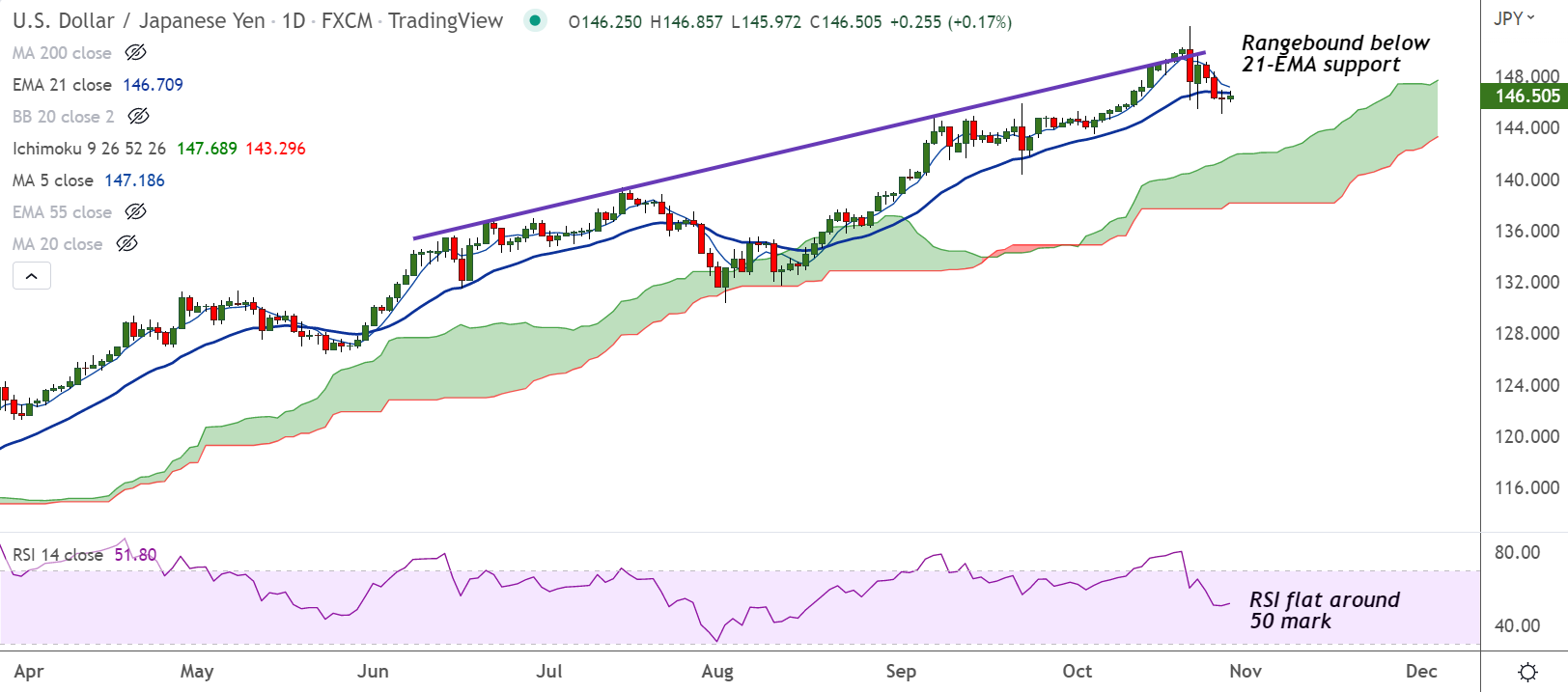 USD/JPY was trading rangebound below 21-EMA at 146.57 at around 06:55 GMT