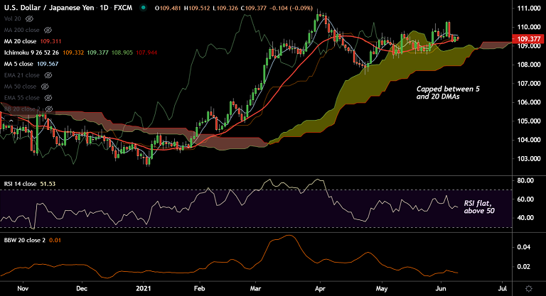 USD/JPY was trading 0.06% lower on the day at 109.41 at around 11:35 GMT, extends choppy trade around 21-EMA.