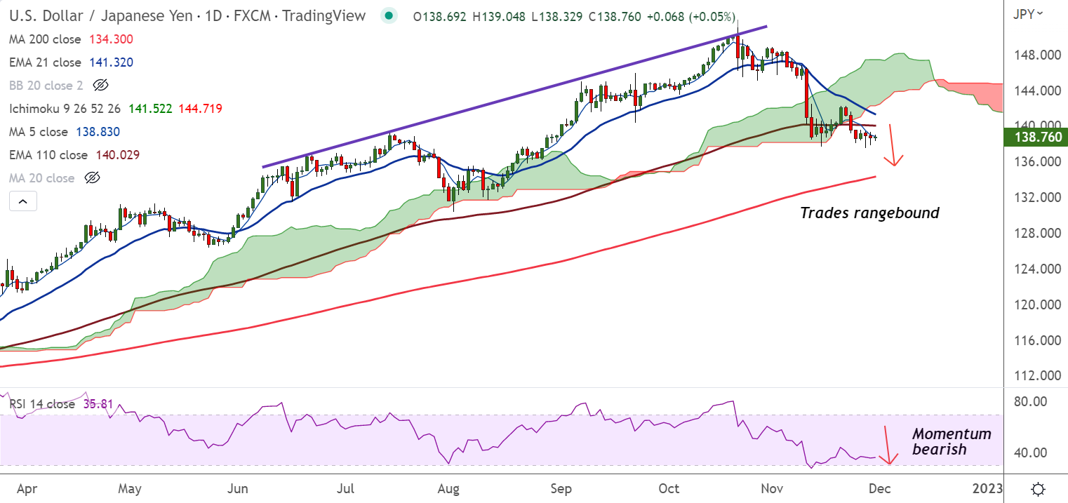 USD/JPY was trading 0.07% higher on the day at 138.78 at around 12:45 GMT, bias lower.