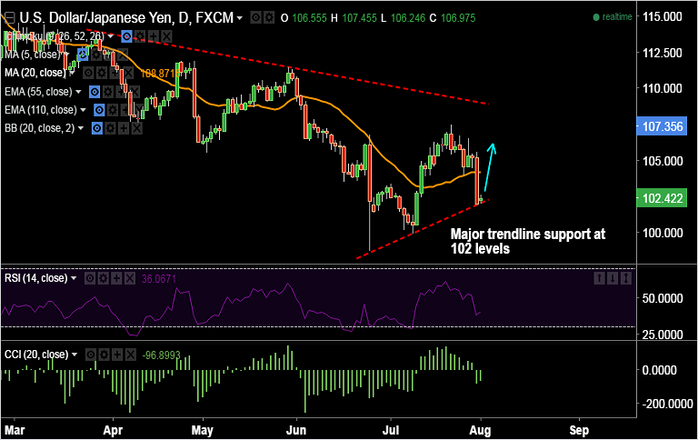 - On the downside, the pair finds strong trendline support at 102 levels, weakness only on break below.