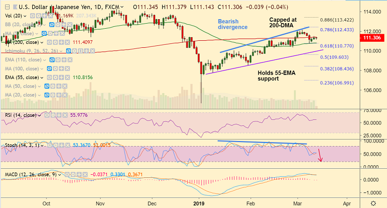 - Technical outlook on the daily charts remains neutral. Break below 55-EMA at 110.81 will increase the bearish bias.