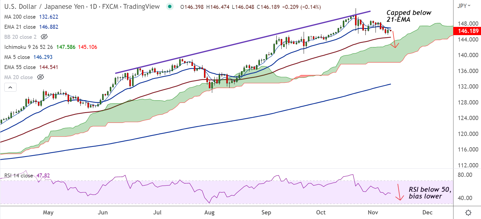 Summary: USD/JPY capped below 21-EMA. Technical bias is bearish. Retrace above 21-EMA will negate any bearish bias.