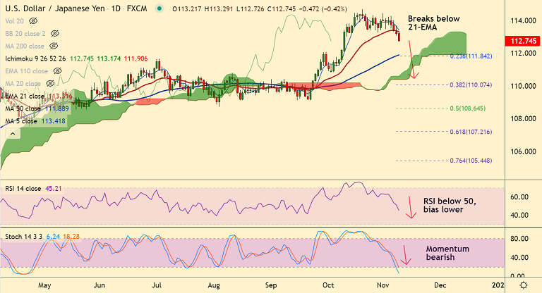 Price action has breached 21-EMA support, and has tested fresh 4-week lows, outlook bearish.
