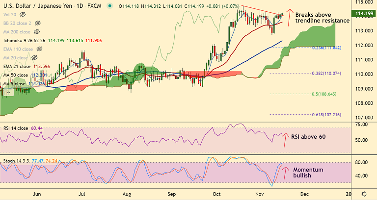 Summary: USD/JPY trades with a bullish bias, poised for further upside. Next bull target lies at 114.70. Bullish invalidation only below 21-EMA.
