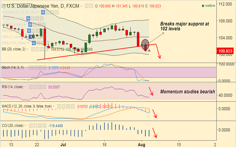 - USD/JPY has broken major trendline support at 102 levels, intraday bias lower.