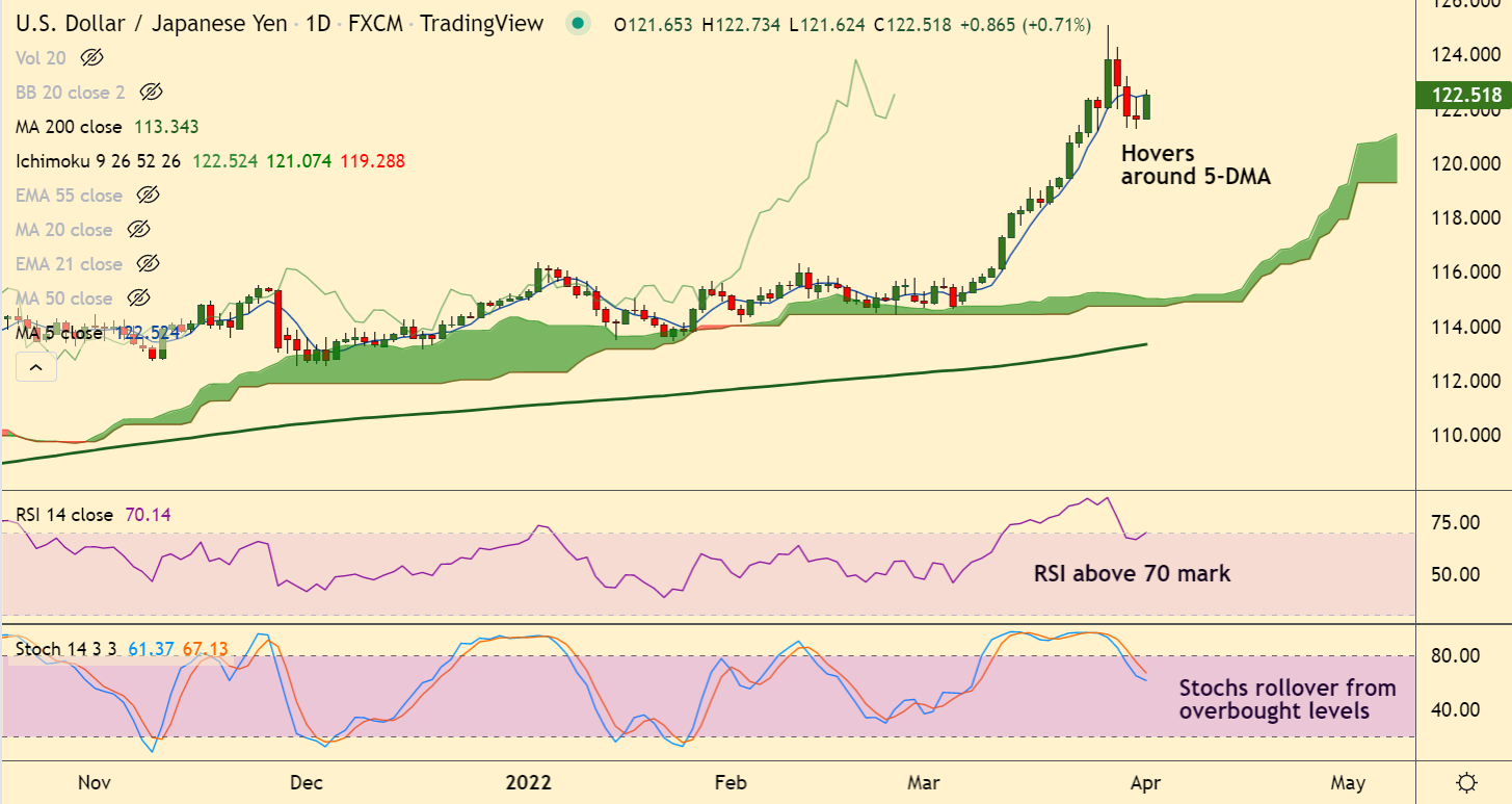 Technical bias for the pair is bullish. Pullbacks on account of overbought conditions are likely to be shallow.