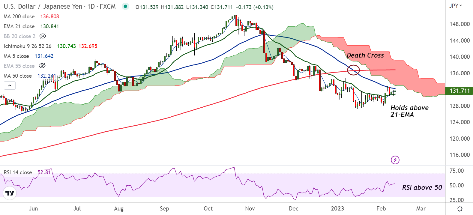 Summary: USD/JPY poised for further upside. Immediate resistance is seen at 50-DMA at 132.24. Retrace below 21-EMA will negate any further gains.