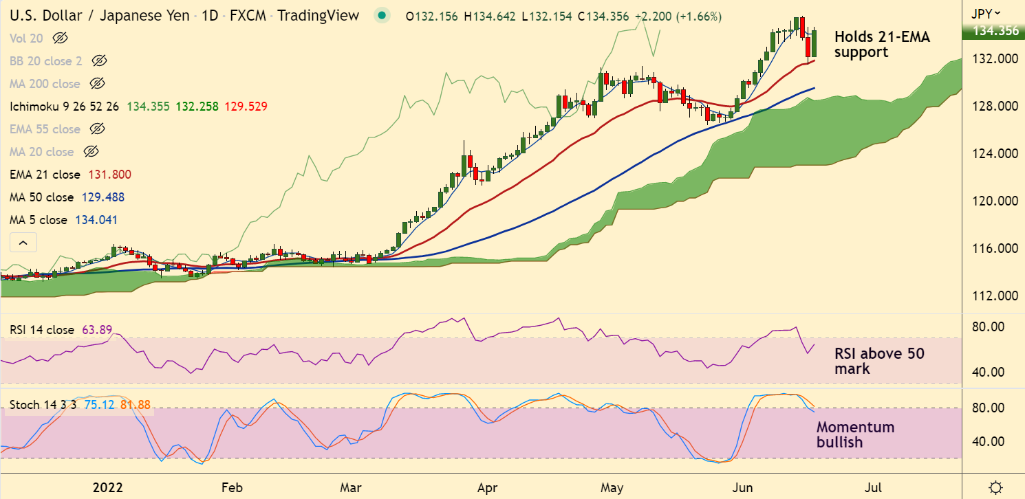 USD/JPY was trading 1.47% higher on the day at 134.09 at around 06:30 GMT, slightly lower from session highs at 134.64.