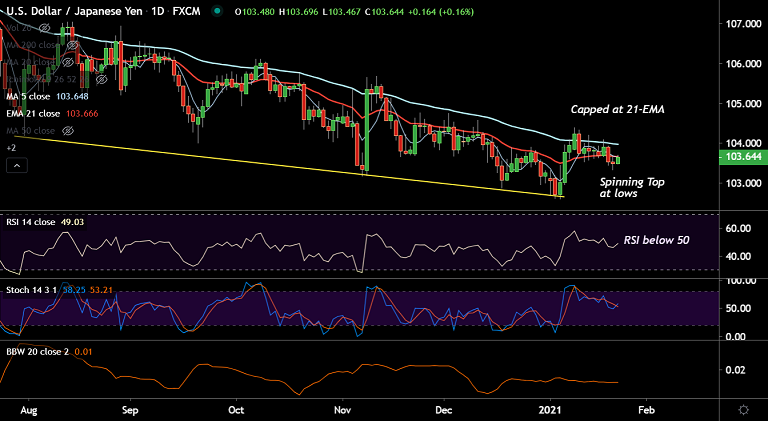 Major trend in the pair is bearish. That said, break above 21-EMA will see gains till 55-EMA at 103.97.