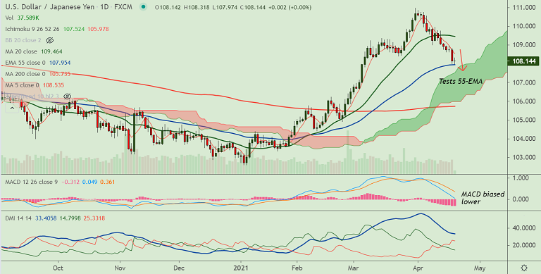 Summary: USD/JPY trades with a bearish technical bias. Watch out for break below 55-EMA support for further downside. Scope for test of cloud support at 107.52.