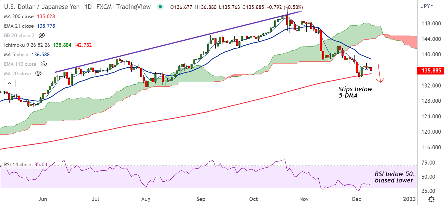 Summary: USD/JPY trades with a bearish bias. 200-DMA is major support and pivot point at 135.02. Breach below will plummet prices. That said, bounce off 200-DMA will negate any further downside.