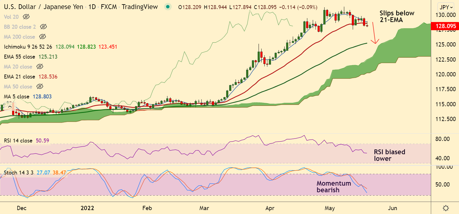 - Price action has slipped below 21-EMA, 5-DMA is biased lower