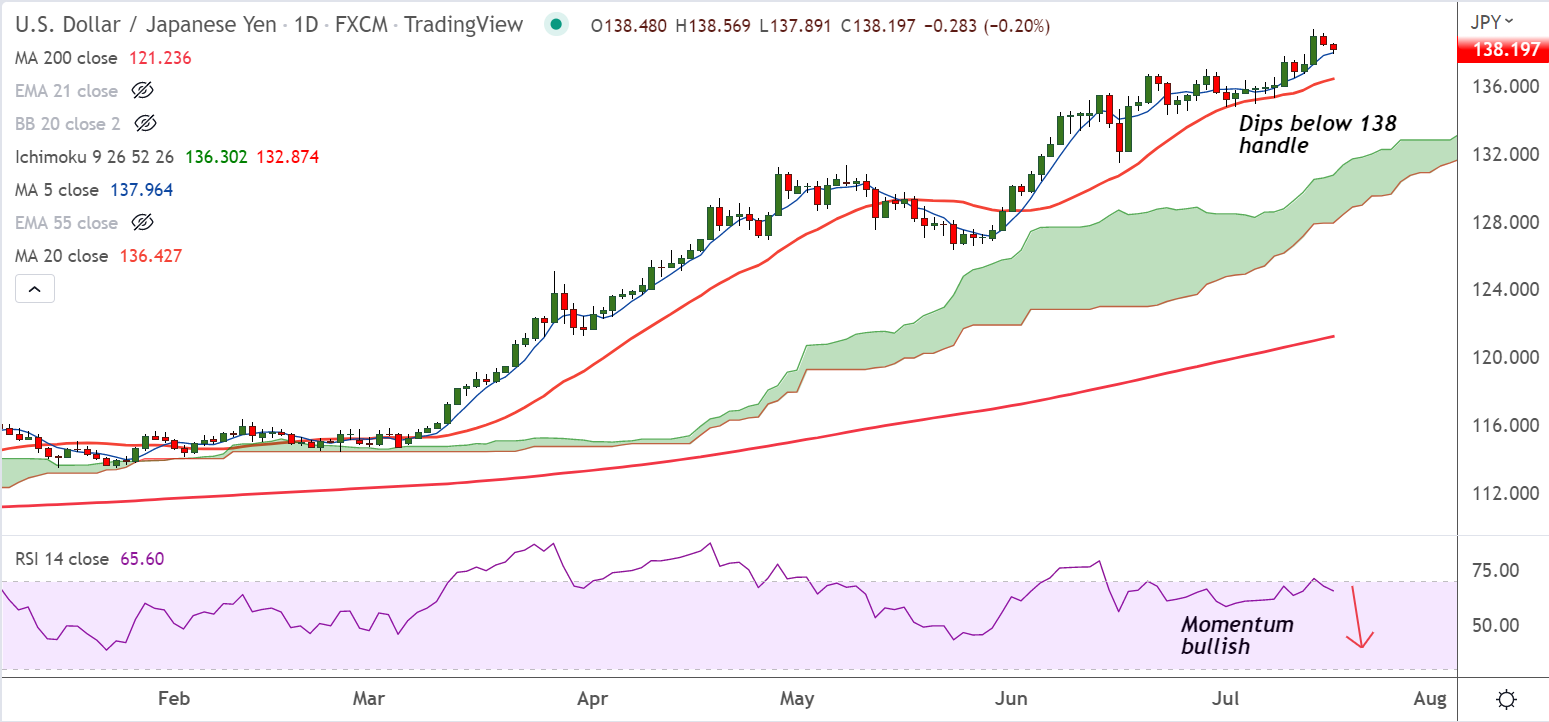 Summary: USD/JPY hovers around 5-DMA. Major trend is bullish. Break below 200H MA will see more weakness.