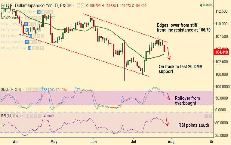 - Next major support aligns at 103.92(20-DMA) ,break below will see drag upto 103.54 (June 16 low).