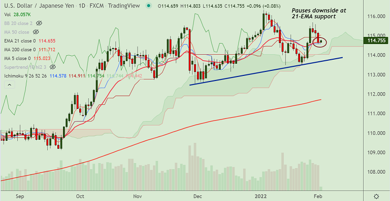 Support - 114.65 (21-EMA), Resistance - 115.01 (5-DMA)