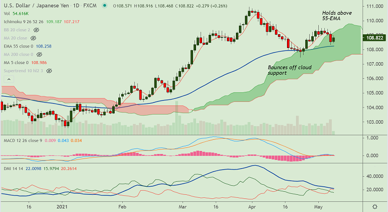 Support - 108.65 (20-DMA), 108.25 (55-EMA), 108